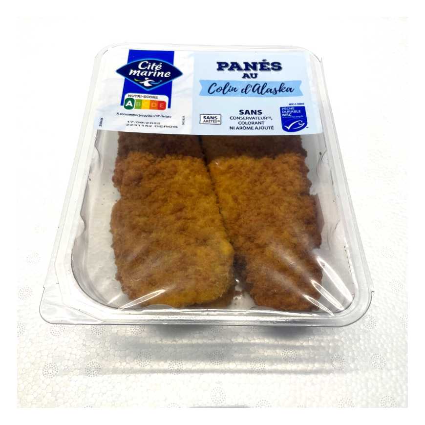 Ingrédients : Préparation à base de colin d'Alaska MSC9) 70% colin d'Alaska 59%, eau, amidon modifié, sel, épaississant : E461. Panure 30% chapelure (farine de blé levure sel, épices : curcuma, paprika), enrobant (eau, farine de blé), huiles végétales (tournesol, colza). Traces possibles de mollusques, œuf, céleri, soja et lait. Les informations en gras sont destinées aux personnes intolérantes ou allergiques.