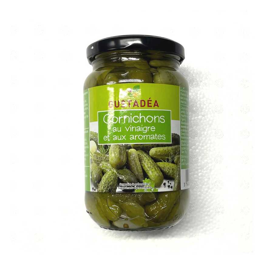 Cornichons pasteurisés au vinaigre et aux aromates.