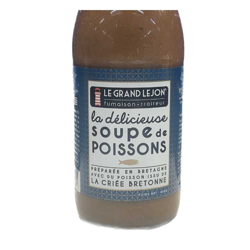 ingrédients: Eau, poissons 30% (origine Bretagne), concentré de tomates, oignons, carottes, huile végétale (tounesol ou colza), sel, épaississants : gomme xanthane et guar, ail, poireaux, lactose, protéines de lait, herbes de Provence, fenouil en poudre, poivre, piment et colorant : paprika. Peut contenir: mollusque, crustacé.