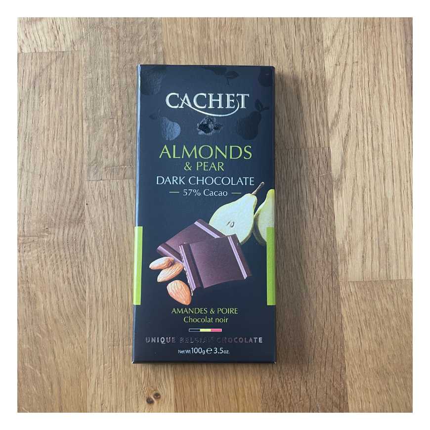 INGRÉDIENTS: Pâte de cacao, sucre, amandes 8%, éclats de poire 4%, beurre de cacao, matière grasse laitière anhydre, arôme naturel de poire, émulsifiant (lécithine de soja). Chocolat noir: cacao 57% min. Peut contenir: gluten, œufs, autres fruits à coque.