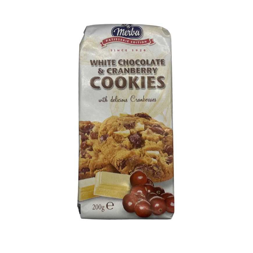 Biscuits avec 21% chocolat blanc et 8% canneberges séchées et sucrées, goût cranberry.