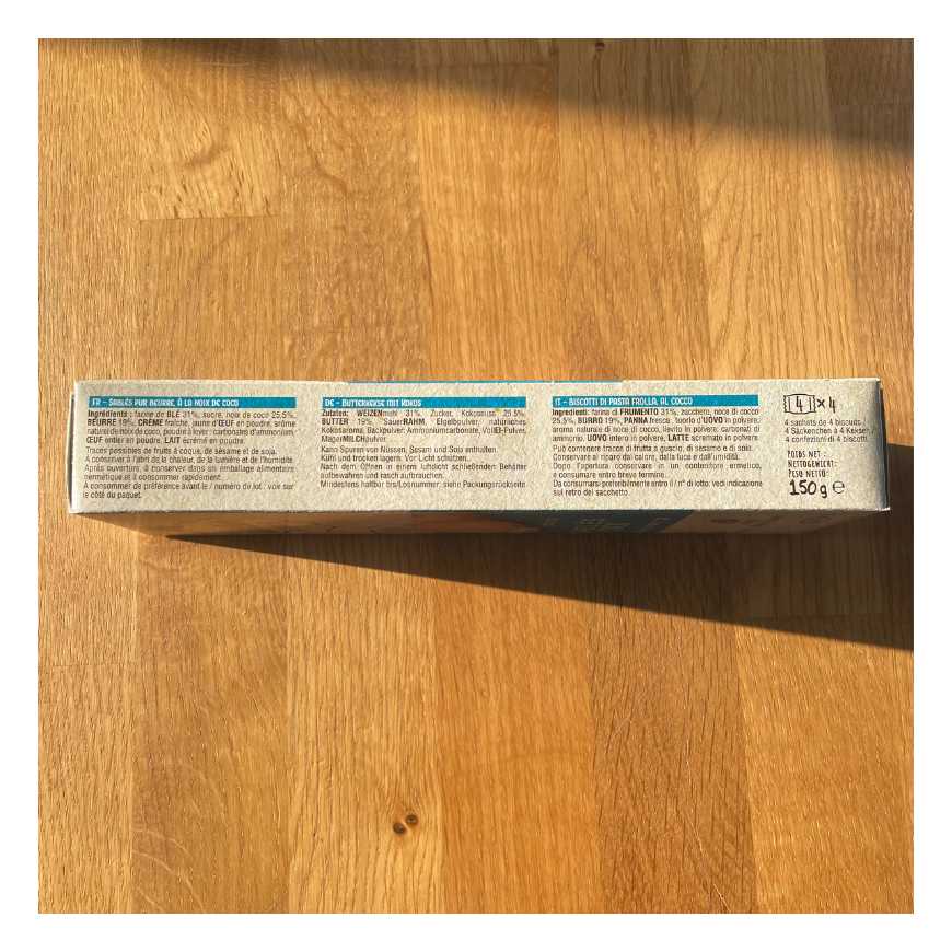 Ingrédients : farine de BLÉ 31%, sucre, noix de coco 25,5%, BEURRE 19%, CREME fraîche, jaune d'ŒUF en poudre, arôme naturel de noix de coco, poudre à lever: carbonates d'ammonium, ŒUF entier en poudre, LAIT écrémé en poudre.