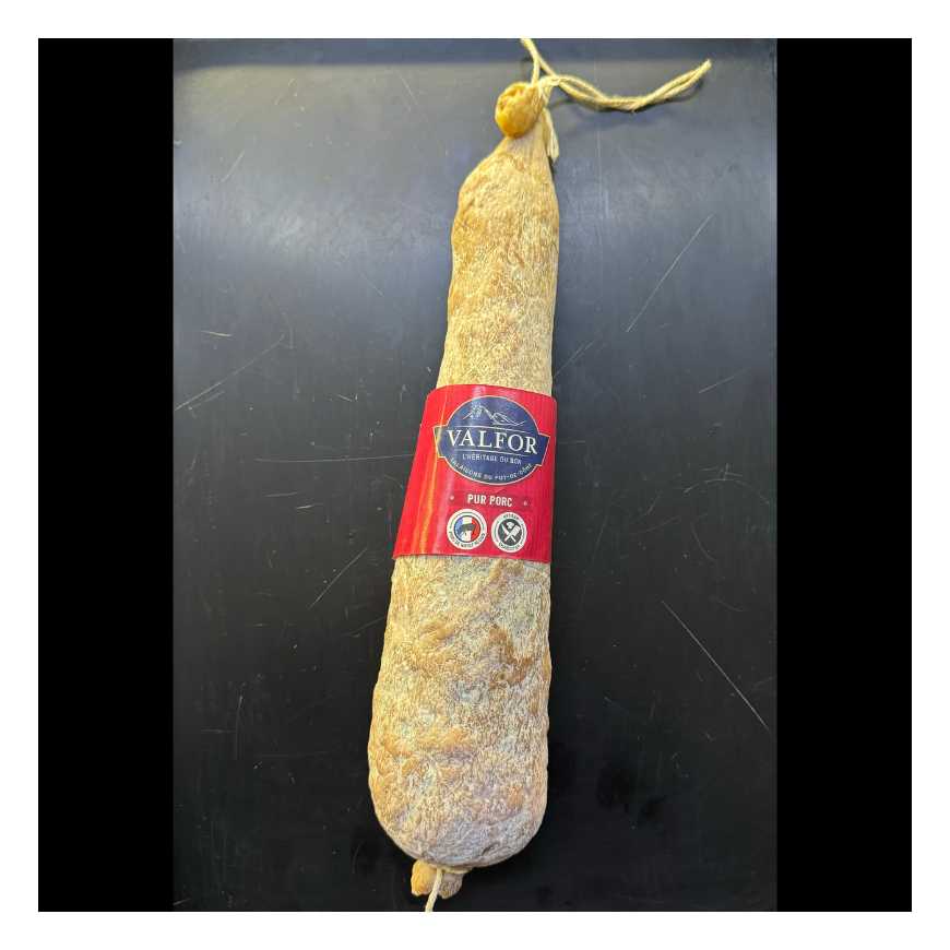 Ingrédients : Viande de porc, gras de porc, sel, (lactose, dextrose, saccharose), épices, plantes aromatiques, ail 3,2%. conservateur : nitrate de potassium, ferment. Boyau naturel de porc. 170 g de viande pour 100 g de produit fini.