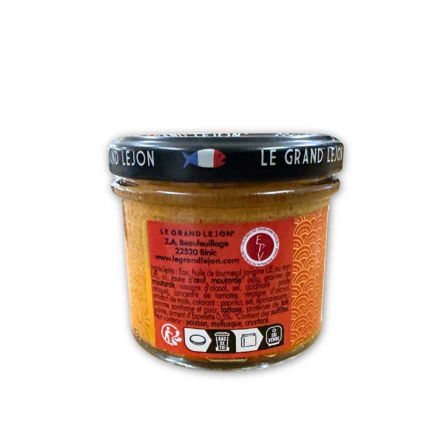Ingrédients : eau, huile de tournesol (origine EU ou non EU) ail, jaune d'oeuf, moutarde*, (eau graines de moutarde, vinaigre d’alcool, sel, acidifiant : acide citrique), concentré de tomates, vinaigre d’alcool, amidon de maïs, colorant : paprika, sel, épaisseur, gomme, xanthane et guar, lactose, protéines de lait, poivre, piment d’Espelette, 0,5 %.