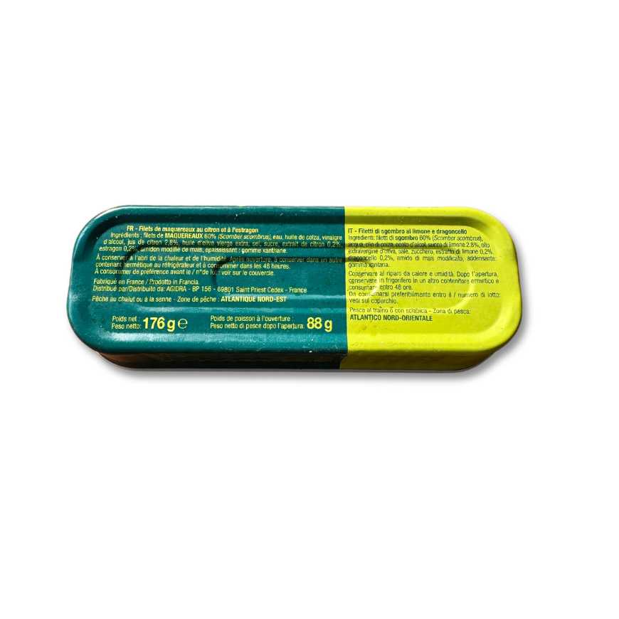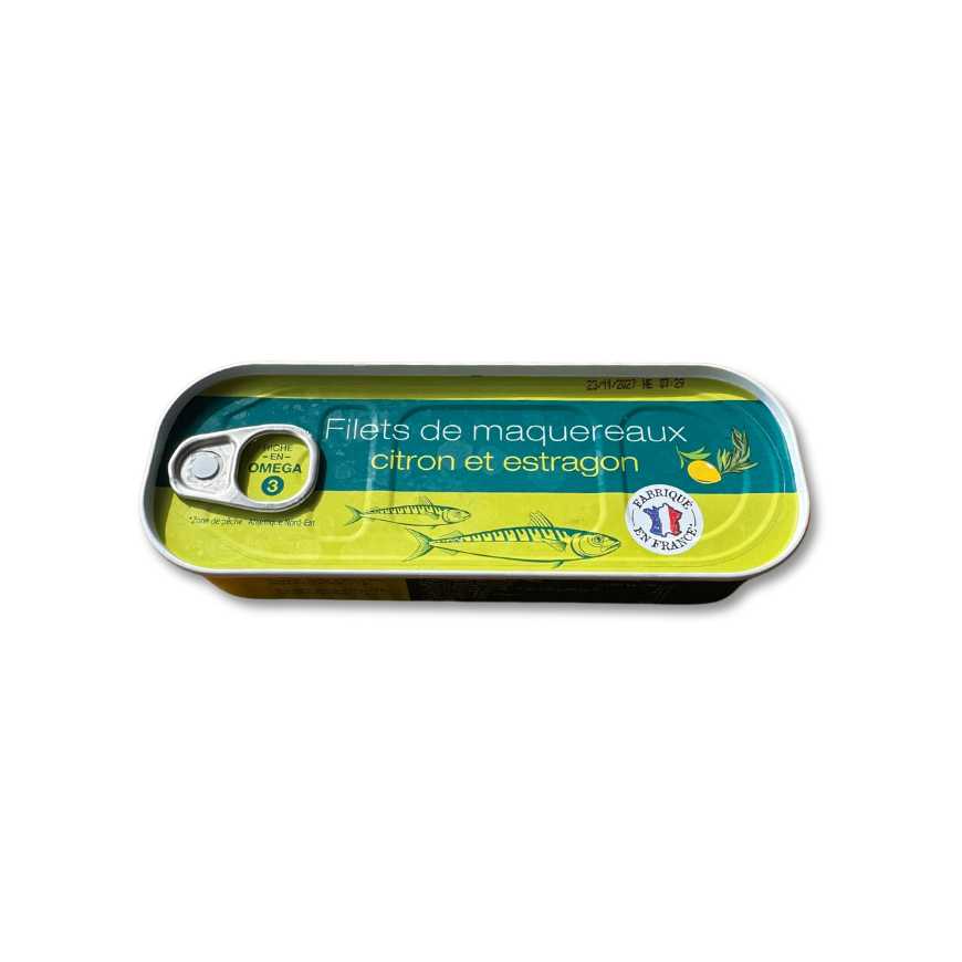 Ingrédients : filets de MAQUEREAUX 60% (Scomber scombrus), eau, huile de colza, vinaigre d'alcool, jus de citron 2,8%, huile d'olive vierge extra, sel, sucre, extrait de citron 0,2% estragon 0,2%, amidon modifié de maïs, épaississant : gomme xanthane.