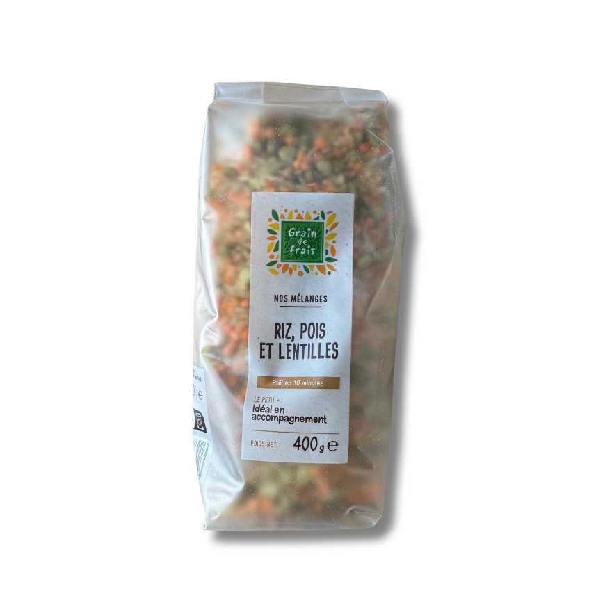 Ingrédients: Riz long grain complet précuit 60%, pois cassés verts précuitrs 20%, lentilles corail 20%.