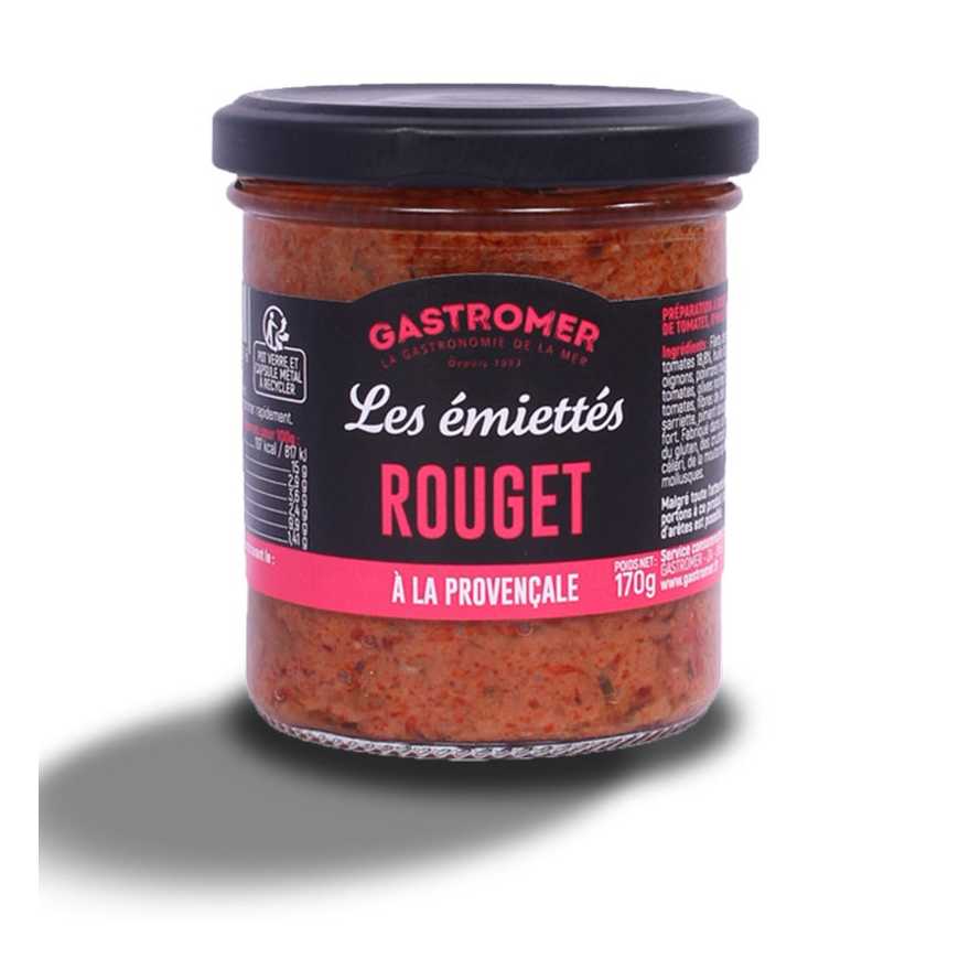 filets de rougets23.8%,cabillaud,tomates18.8%,huile d'olive vierge extra10.5%oignons,poivrons rouges et verts,concentré de tomates,olives noires taggiasca, jus de tomates,fibres de blé,sel,ail0.5%,sarriette,piment doux,thym,poivre,piment fort. Fabriqué dans un atelier qui utilise du lait,du gluten,des crustacés,de l'oeuf,du soja,du céleri et des mollusques.