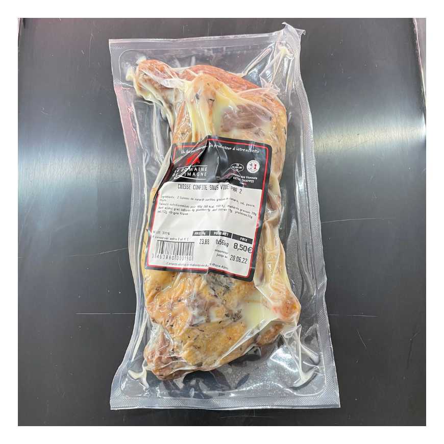 Poche de 356 g emballée sous/vide cuisse confite cuite dans la graisse de canard DLC environ de 20 jours conservation au frigo