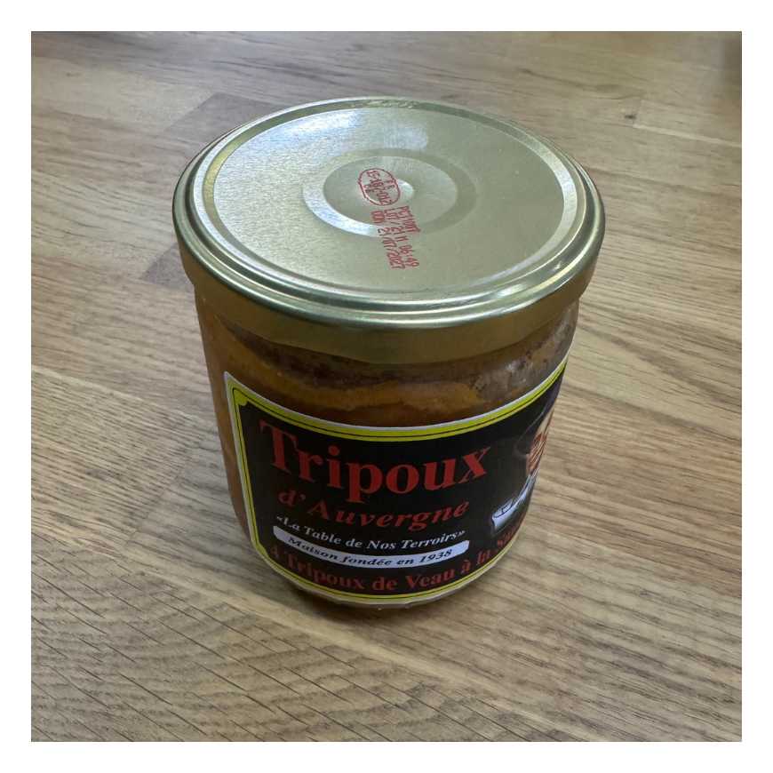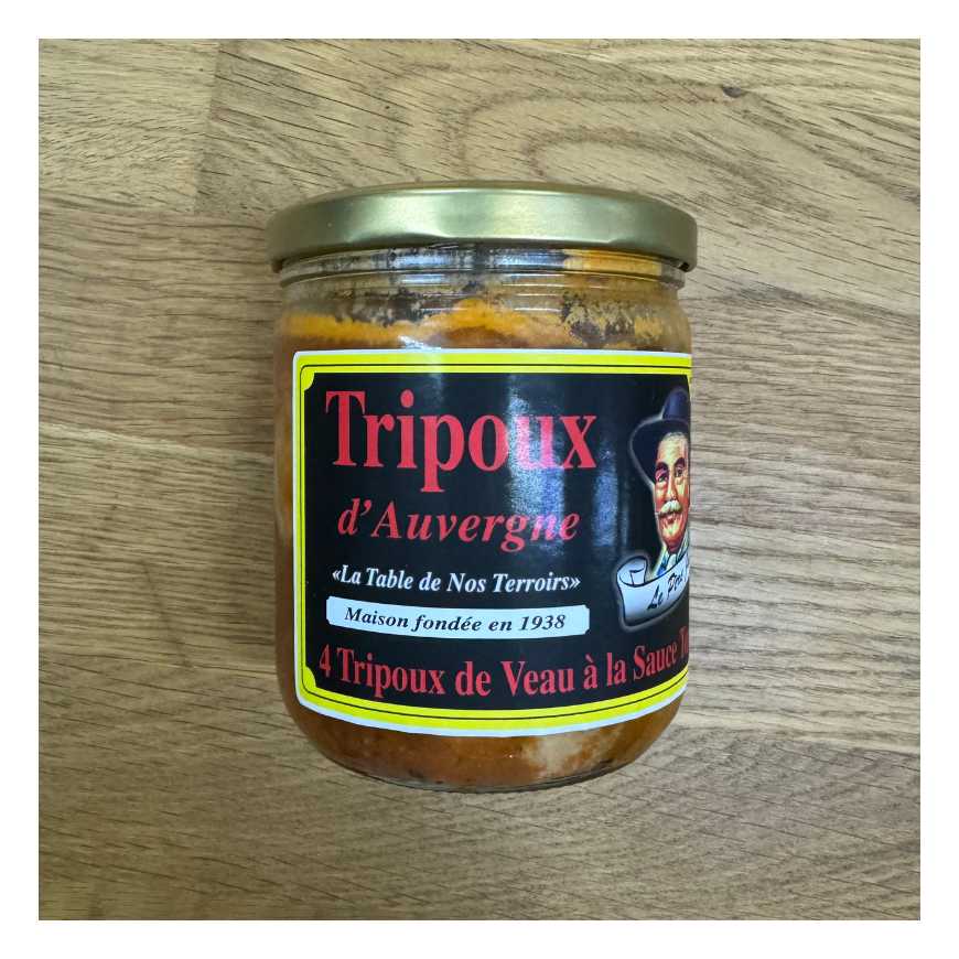 Tripoux 63%(panse de veau 53%,panse d'agneau,boyau de porc, sel,épices et plantes aromatiques, huile de tournesol), eau, vin blanc 6.1%, gélatine de porc catégorie G, carotte, fond de volaille, sel, épices et plantes aromatique, oignon, ail, céleri, poivre. Traces éventuelles de: lait, gluten, poissons, fruits à coque, soja, crustacés, mollusques, oeufs, moutarde.