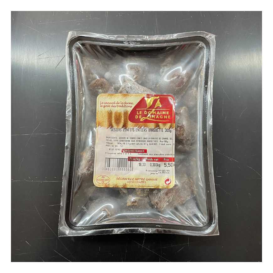 Gésiers de canard confit dans la graisse de canard après assaisonnement Barquette pour environ 3 personnes Barquette sous atmosphère protectrice DLC environ 21 jours
