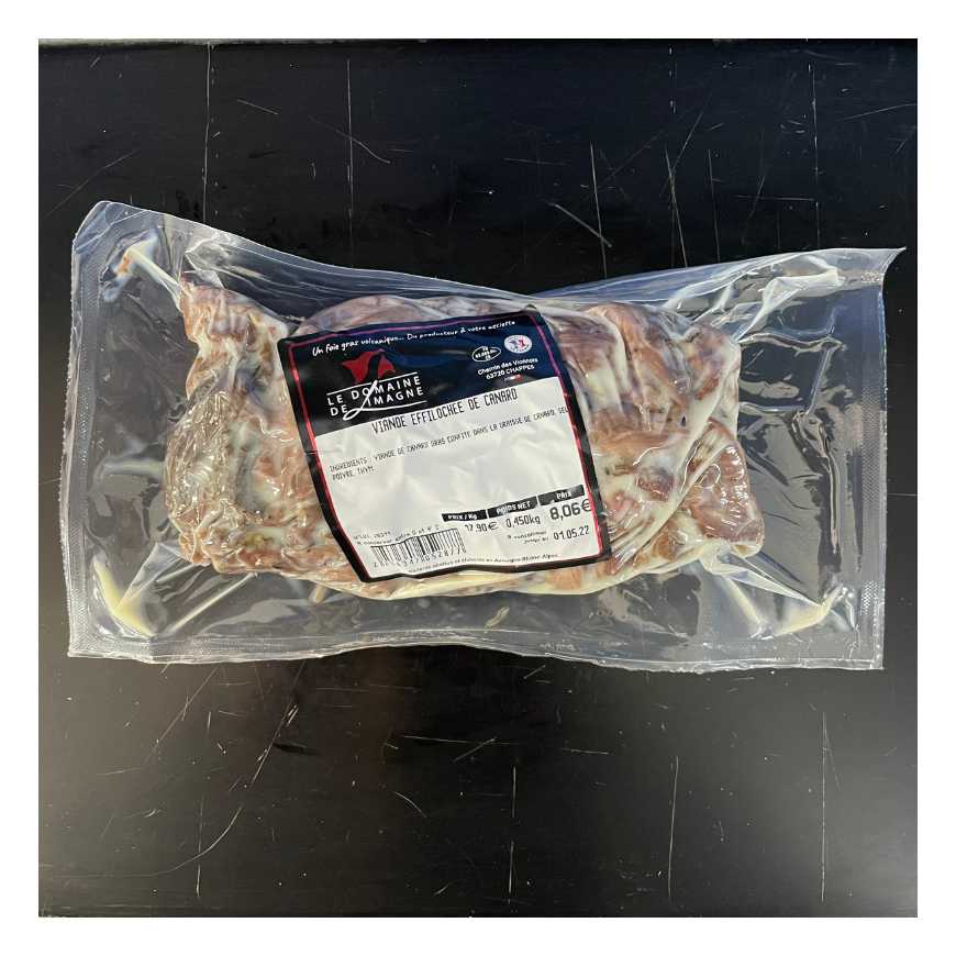 Cette viande vient de la cuisse confite, désossée avec soin puis mis sous vide avec un peu de graisse de canard fondu DLC environ 14 jours conservation au frigo